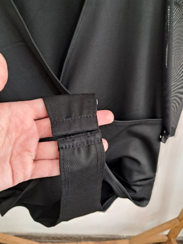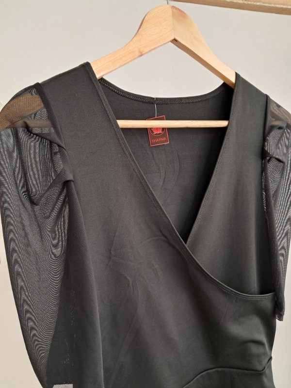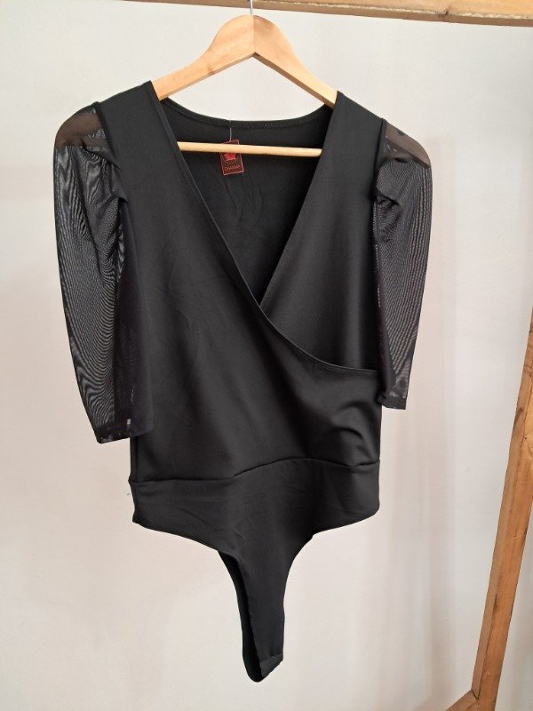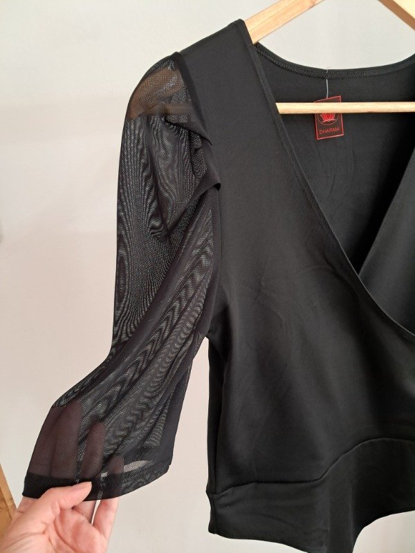 Body de lycra con escote cruzado y mangas de microtul corte princesa.
