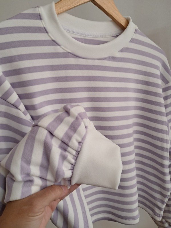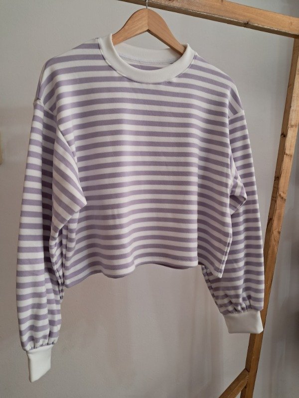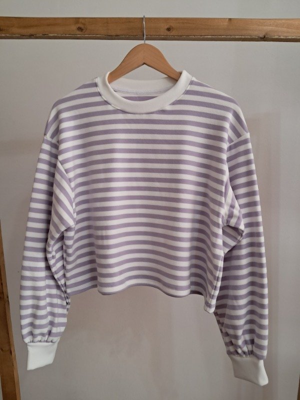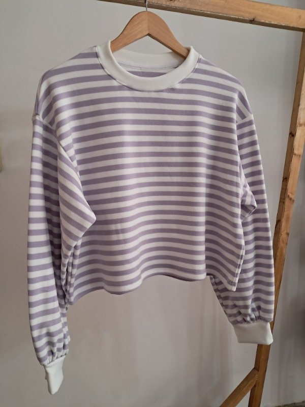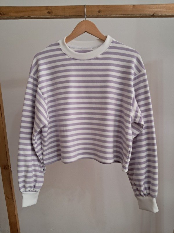 Buzo plush rayado, corte a la cintura y detalle de manga globo.