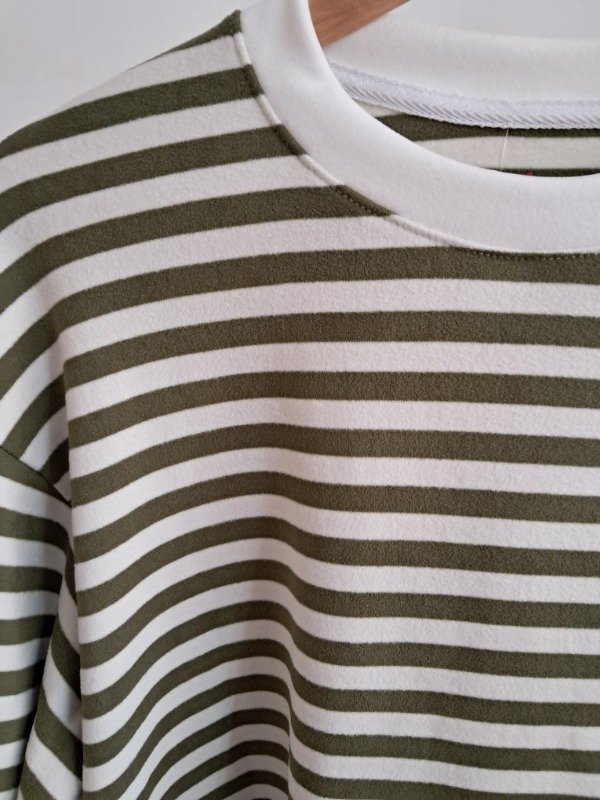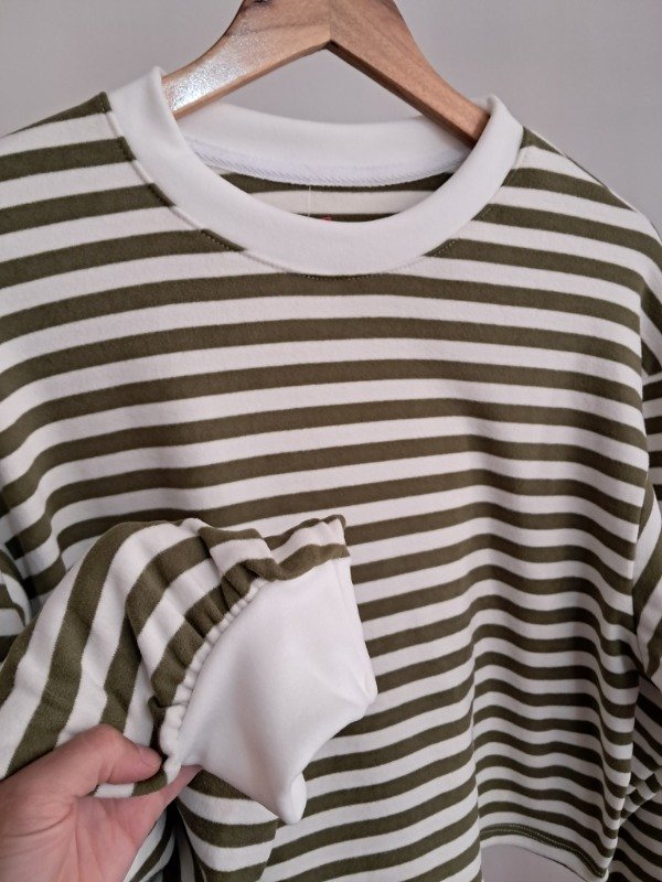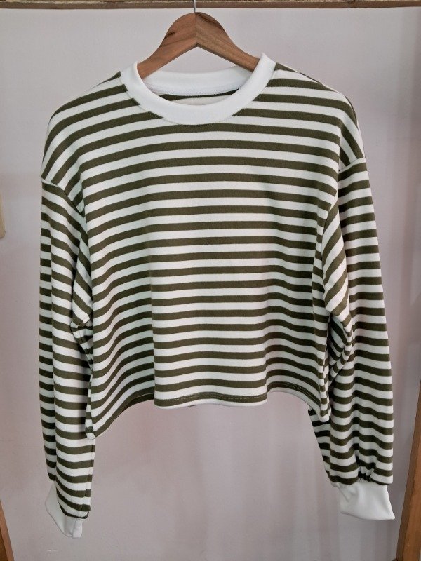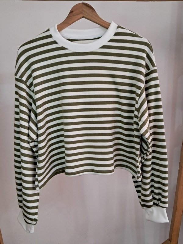 Buzo plush rayado, corte a la cintura y detalle de manga globo.