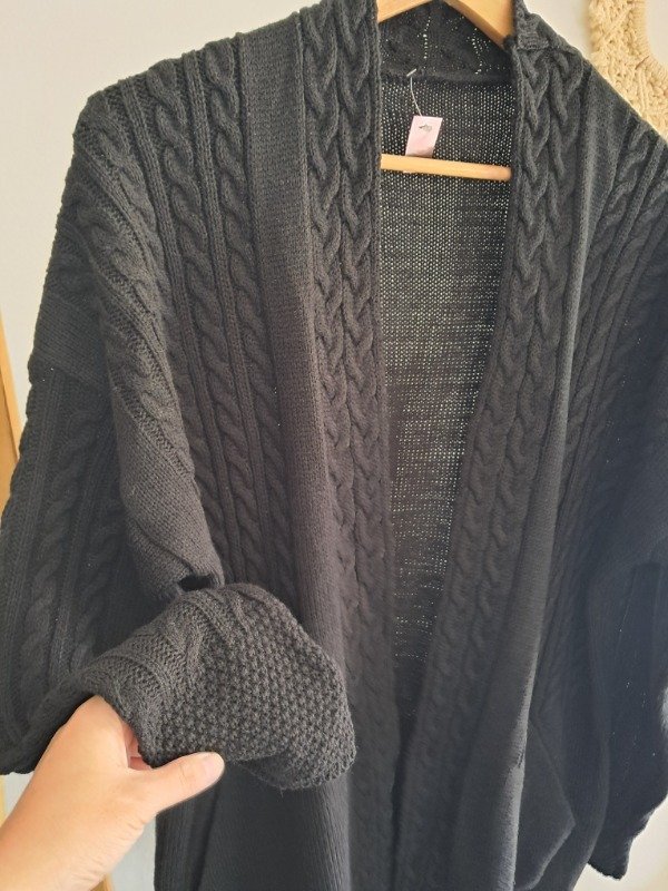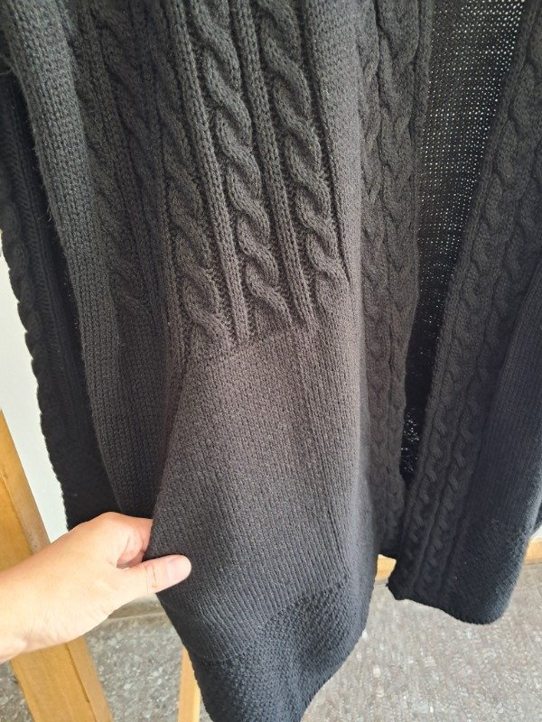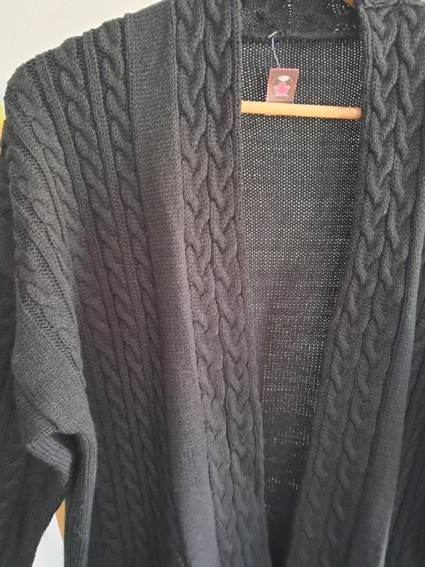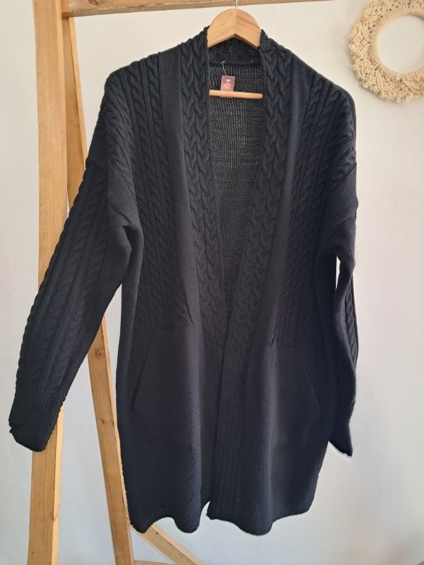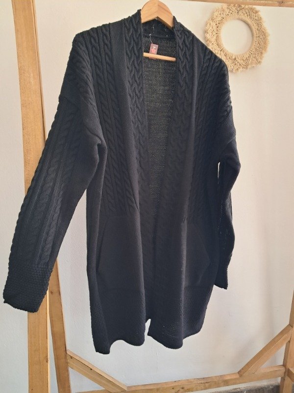 Campera cazadora tejida en lana, con bolsillos y detalles en trenzado.