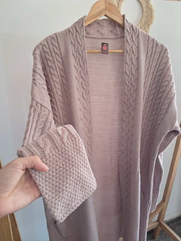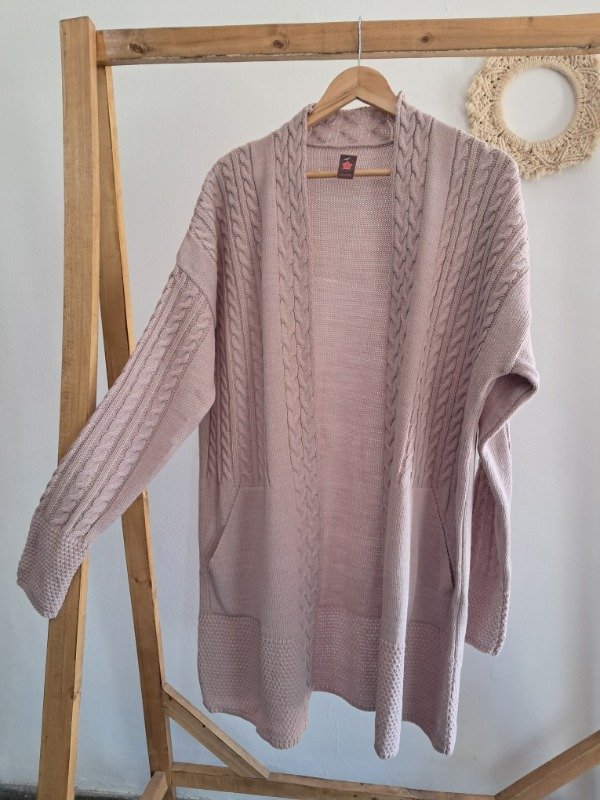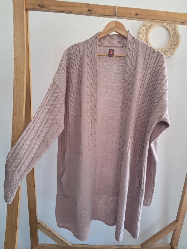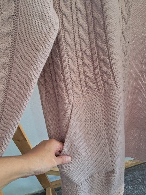 Campera cazadora tejida en lana, con bolsillos y detalles en trenzado.