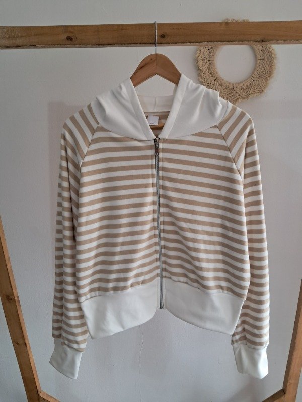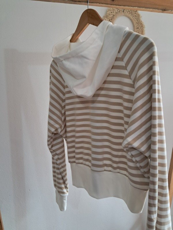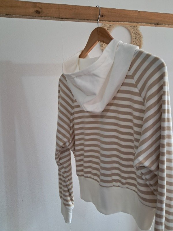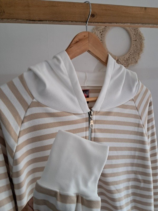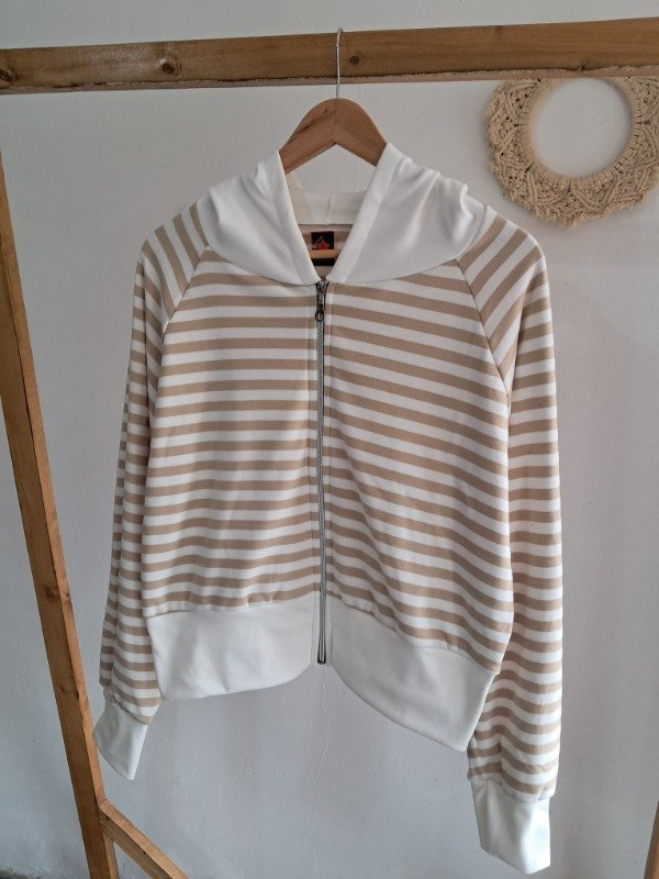 Campera de Darlon plush en rayado con detalle de puño y capucha en color hueso, una prenda super canchera y con mucha onda.
