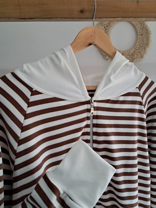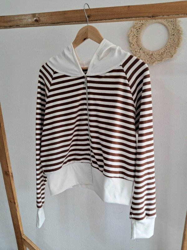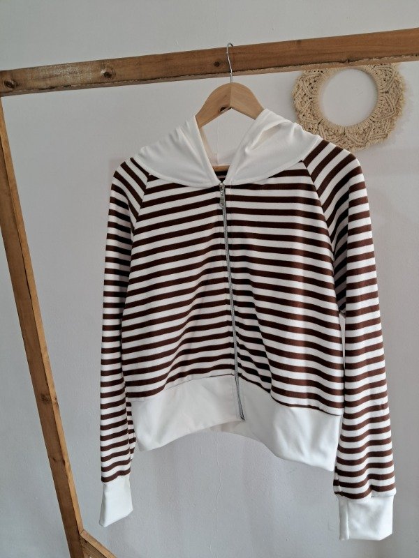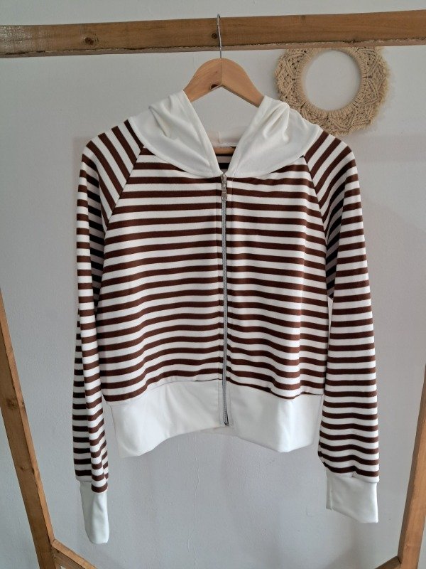 Campera de Darlon plush en rayado con detalle de puño y capucha en color hueso, una prenda super canchera y con mucha onda.
