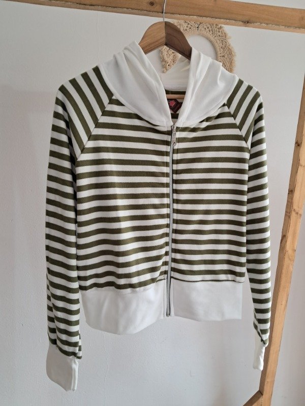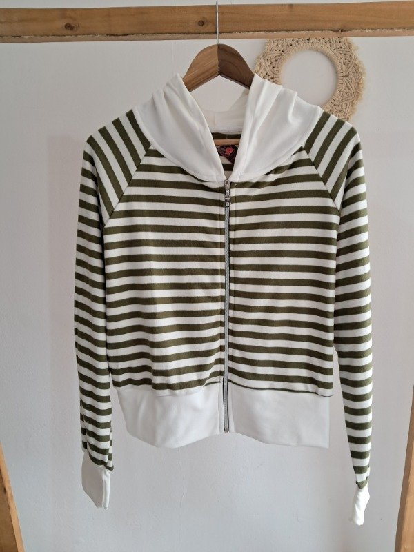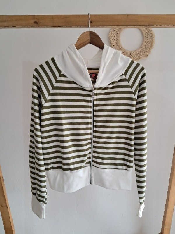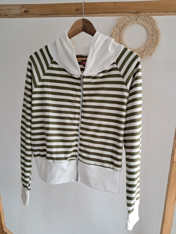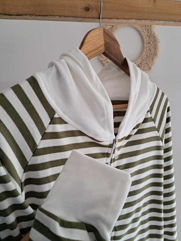 Campera de Darlon plush en rayado con detalle de puño y capucha en color hueso, una prenda super canchera y con mucha onda.