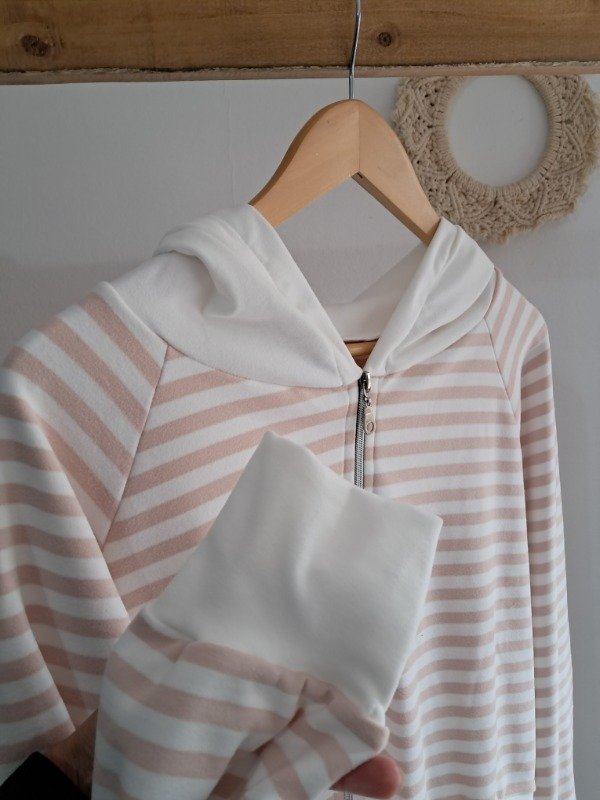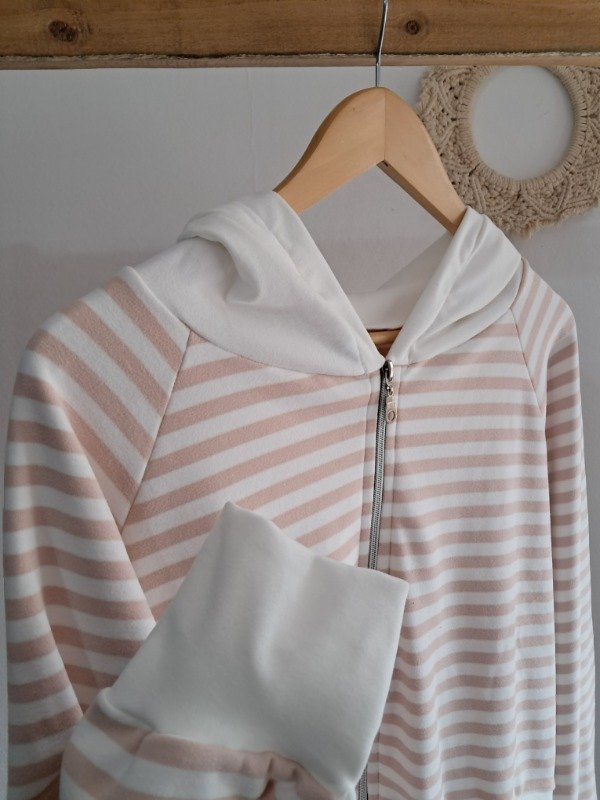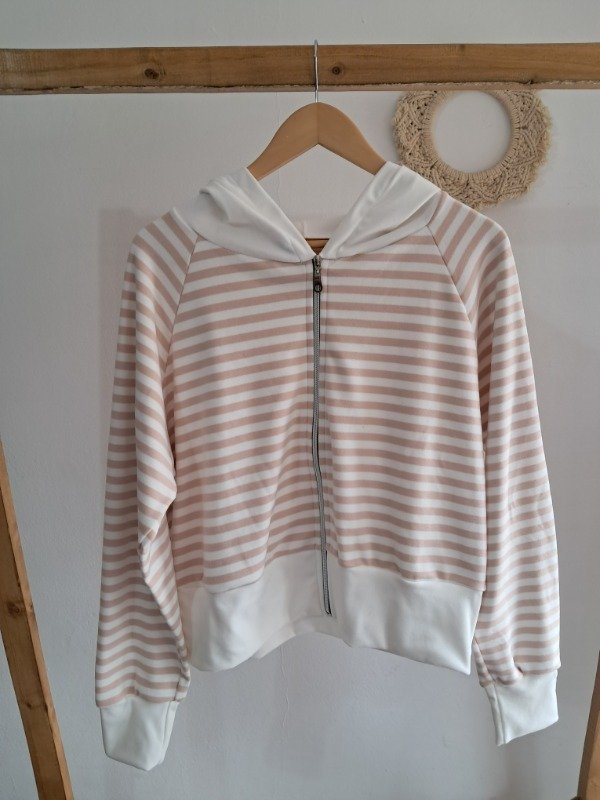 Campera de Darlon plush en rayado con detalle de puño y capucha en color hueso, una prenda super canchera y con mucha onda.