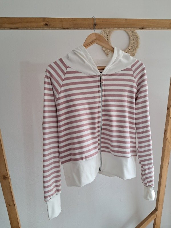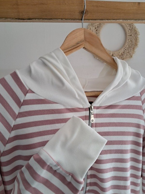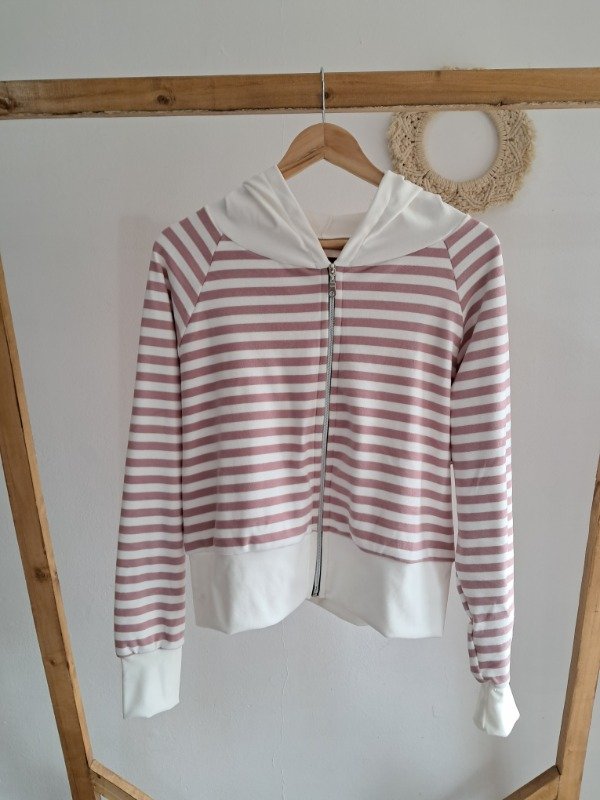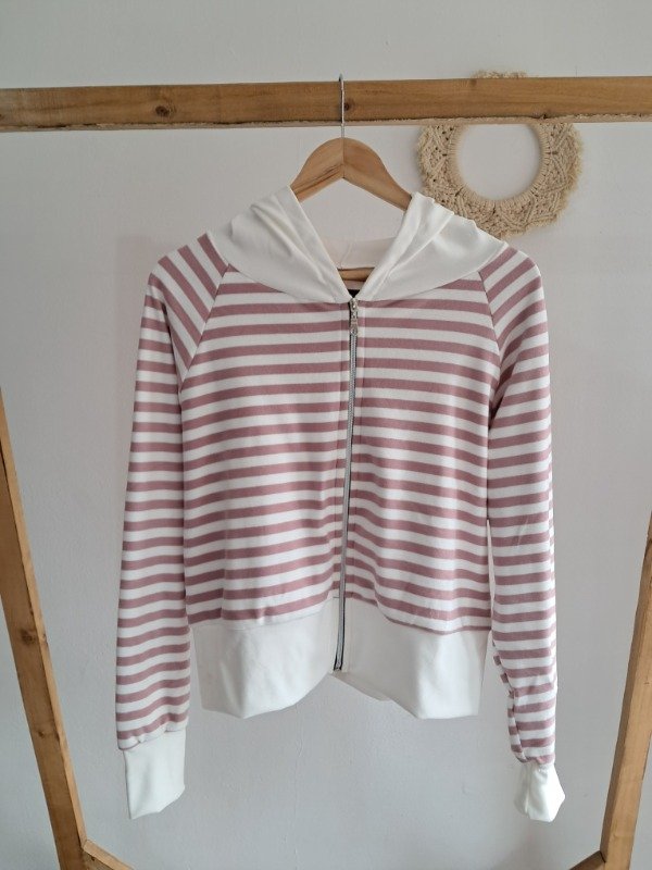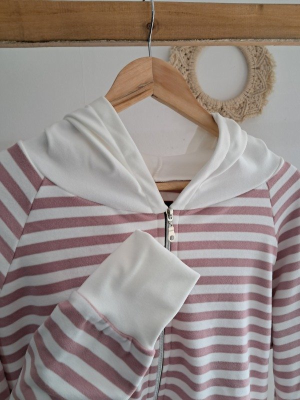 Campera de Darlon plush en rayado con detalle de puño y capucha en color hueso, una prenda super canchera y con mucha onda.
