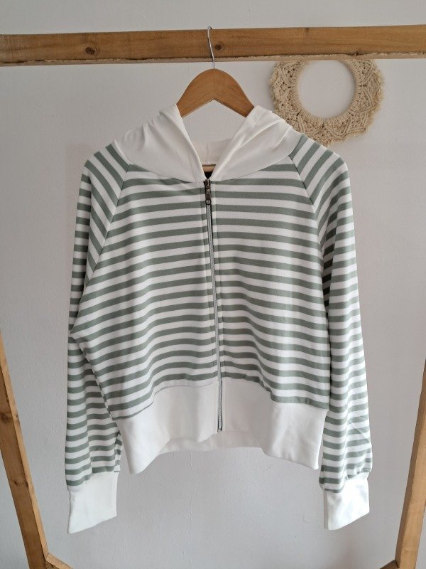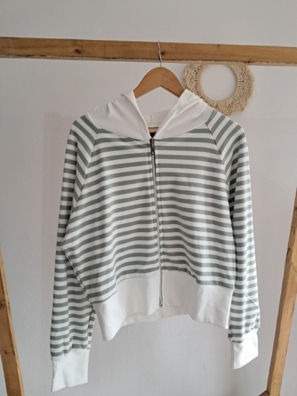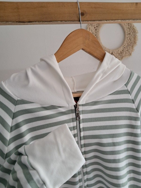 Campera de Darlon plush en rayado con detalle de puño y capucha en color hueso, una prenda super canchera y con mucha onda.