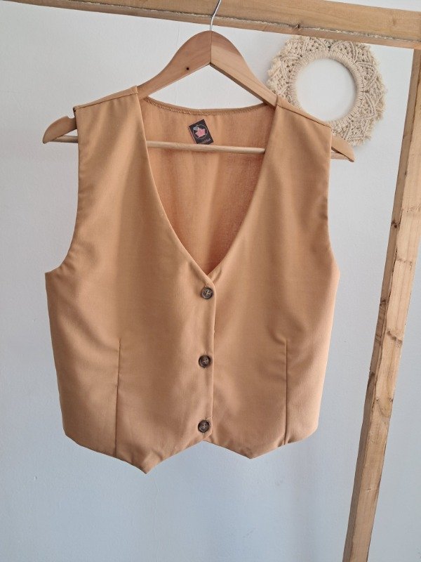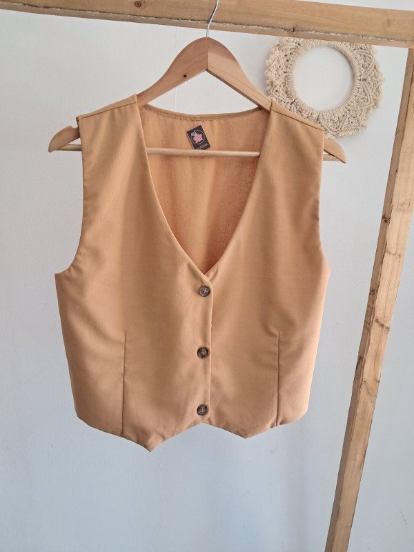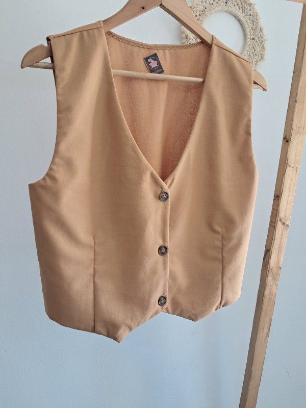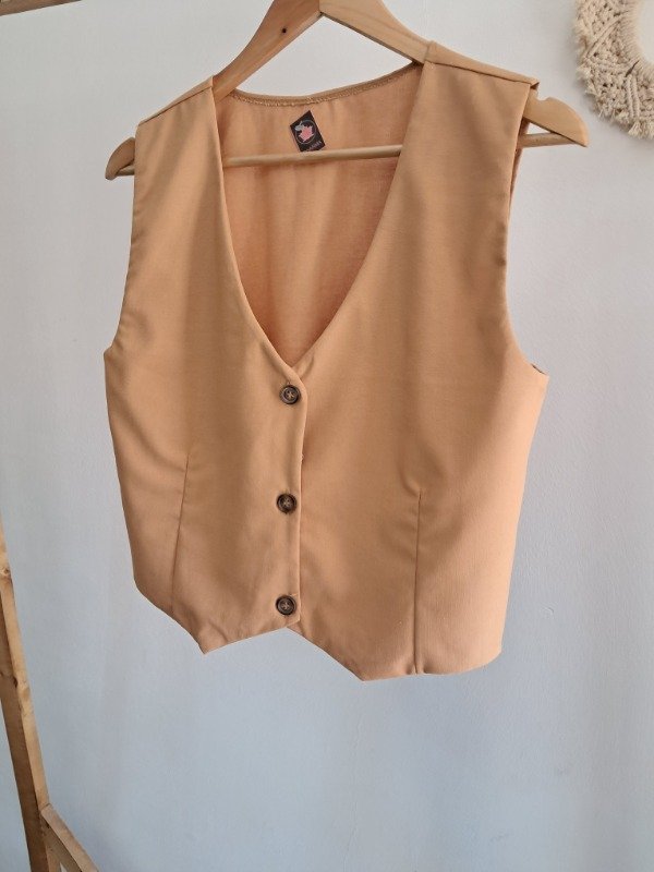 -Chaleco con botones simil madera y corte pinzado delantero.