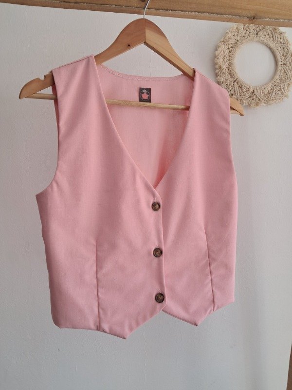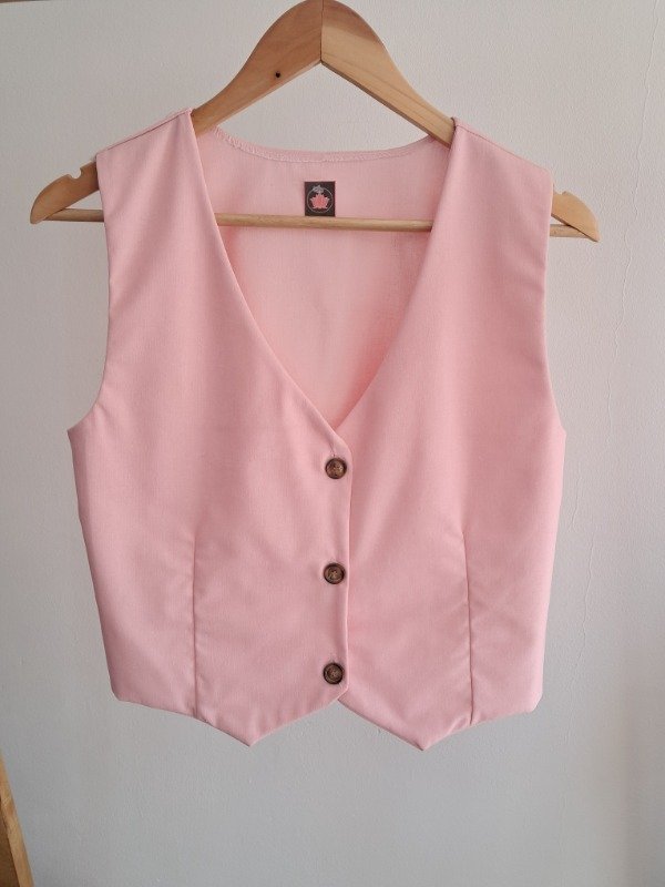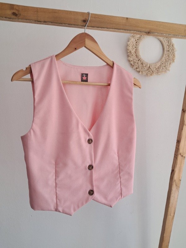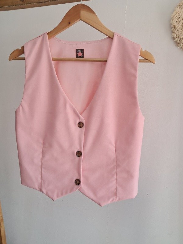 -Chaleco con botones simil madera y corte pinzado delantero.