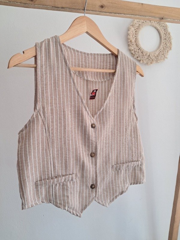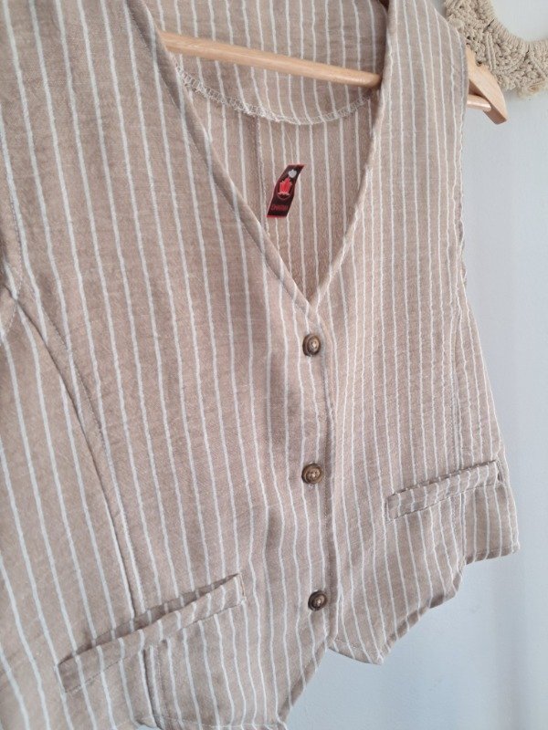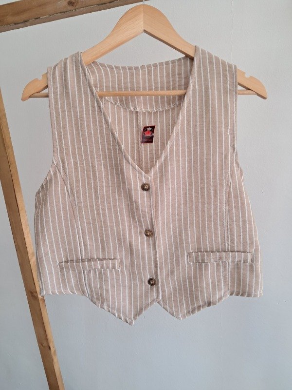 -Chaleco con botones simil madera y corte pinzado delantero.