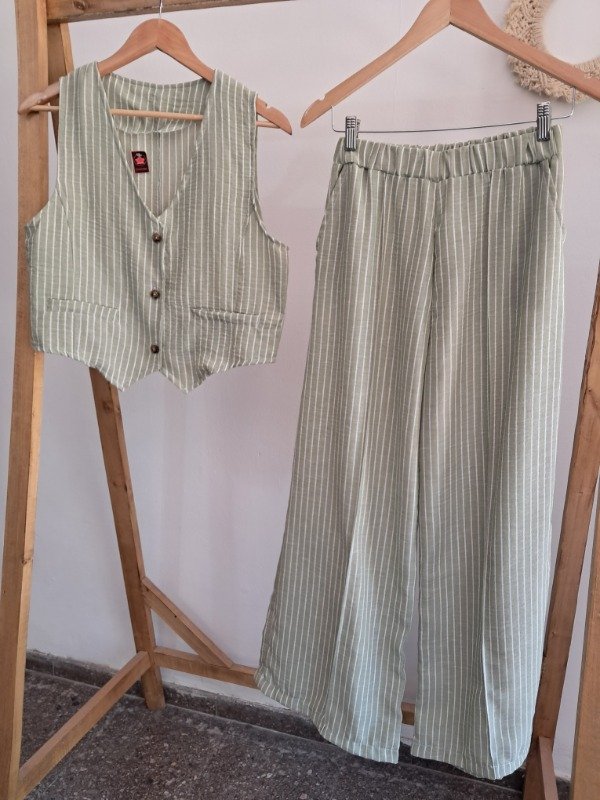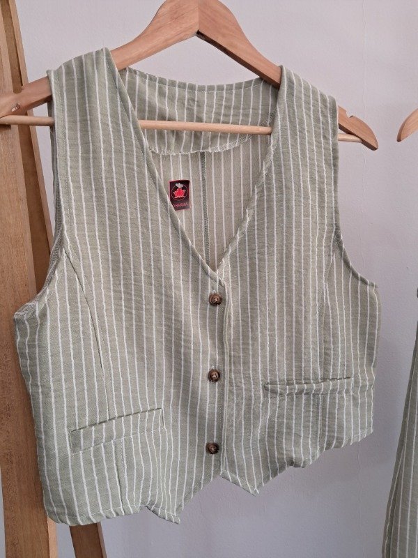 -Chaleco con botones simil madera y corte pinzado delantero.