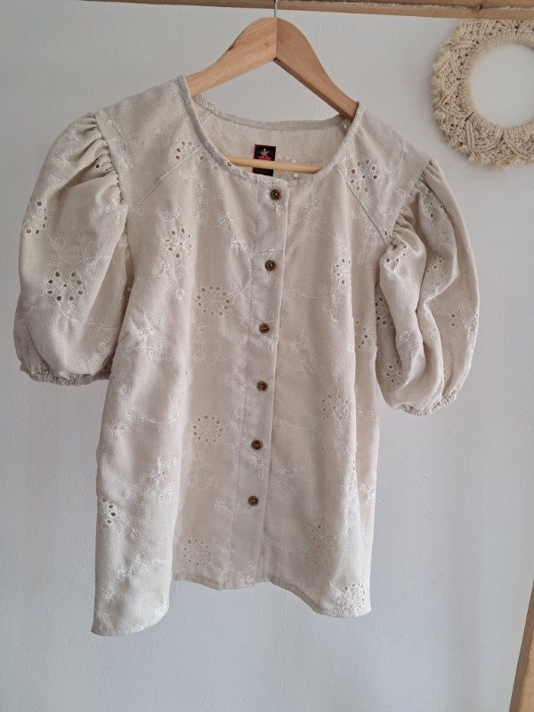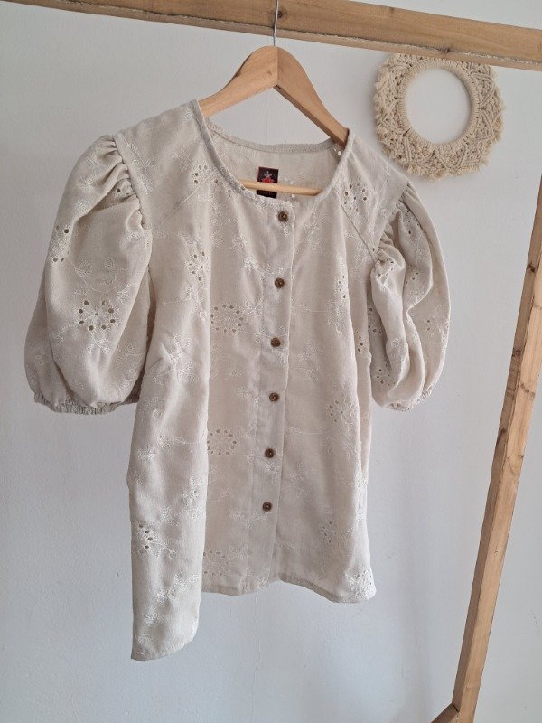 Camisola de broderie con botones delanteros y manga estilo princesa.