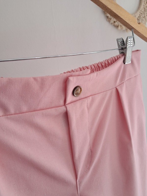 -Short con boton simil madera y cierre, corte de pinzas delanteras. Tiro alto, posee la mitad de la cintura fija y mitad elastizada asegurando tu comodidad, dobles en la terminación de la pierna.