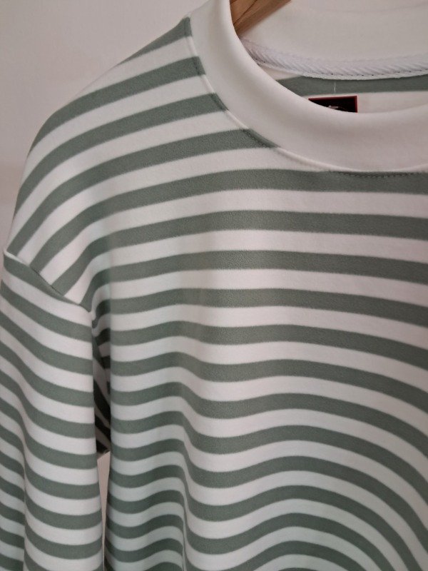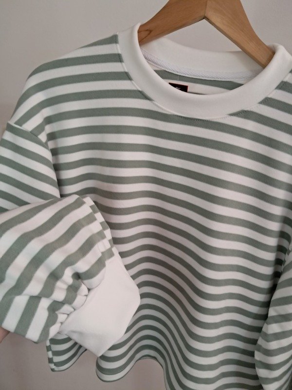 Buzo plush rayado, corte a la cintura y detalle de manga globo.