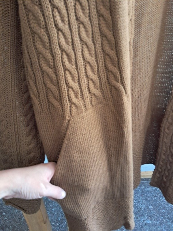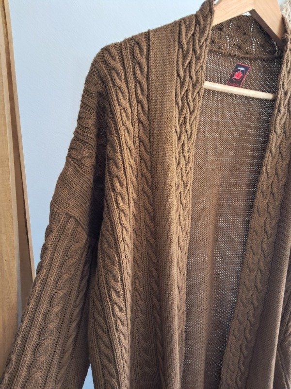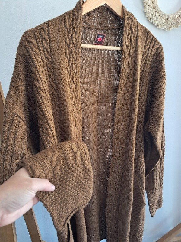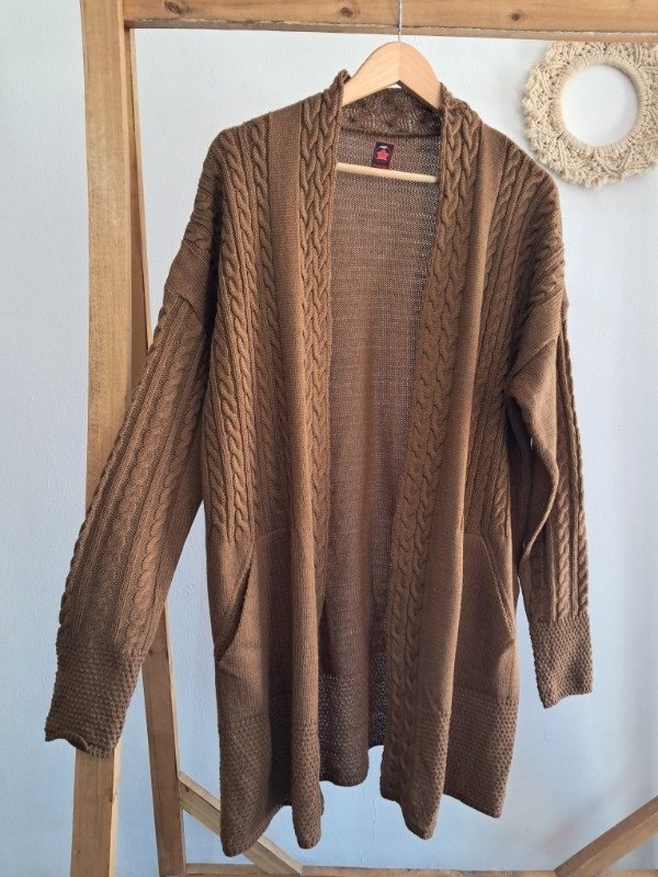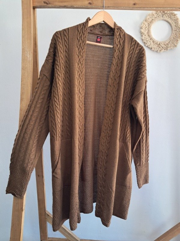 Campera cazadora tejida en lana, con bolsillos y detalles en trenzado.